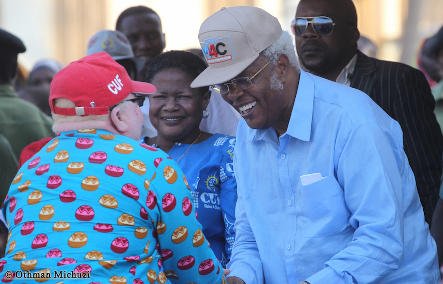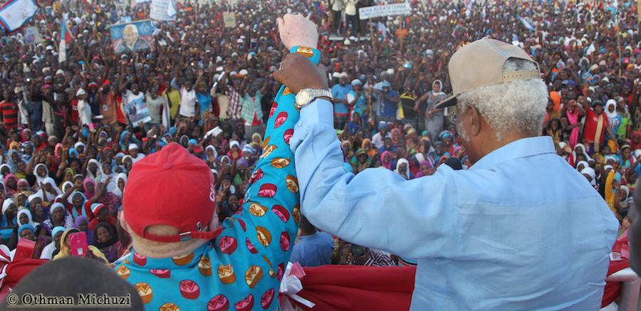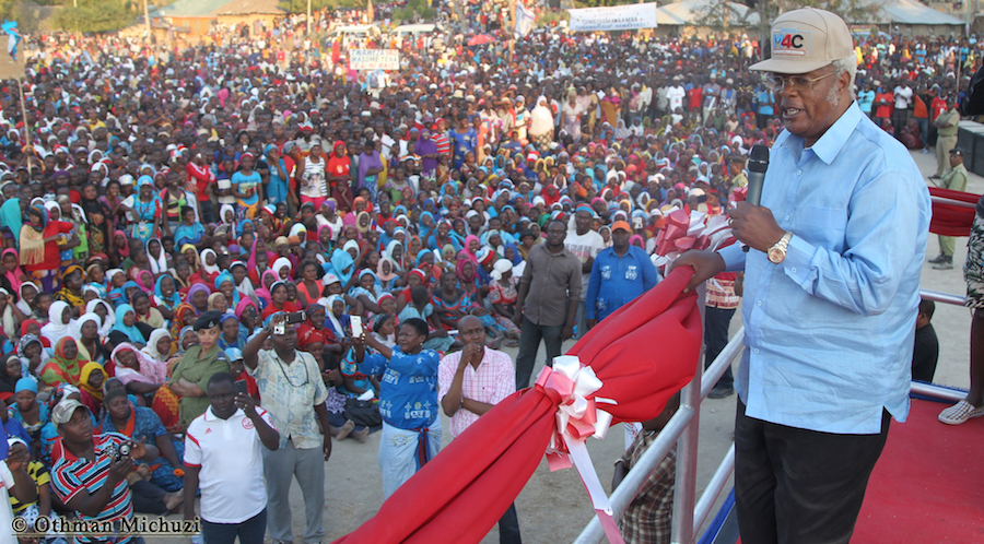 Mgombea Urais wa Tanzania wa UKAWA kupitia Chama cha Demokrasia na Maendeleo (CHADEMA), Edward Lowassa, akimnadi Mgombea Ubunge wa Jimbo la Lindi Mjini kwa tiketi ya Chama cha Wananchi CUF kupitia Mwamvuli wa UKAWA, Salum Barwany, katika Mkutano wa Kampeni uliofanyika kwenye Uwanja wa Shule ya Msingi Pilipili, Lindi Mjini, Septemba 23, 2015.