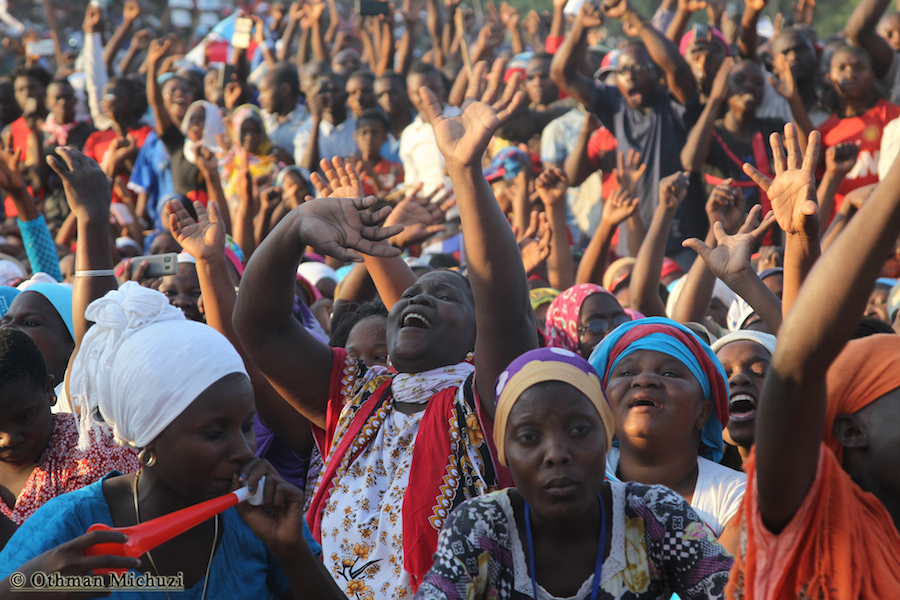 Wananchi wa Jimbo la Mtama, Mkoani Lindi wakionyesha furaha yao kwa ujio wa Mgombea Urais wa Tanzania wa UKAWA kupitia Chama cha Demokrasia na Maendeleo (CHADEMA), Edward Lowassa, katika Mkutano wa Kampeni uliofanyika kwenye Uwanja wa Soko la Majengo, Septemba 23, 2015.