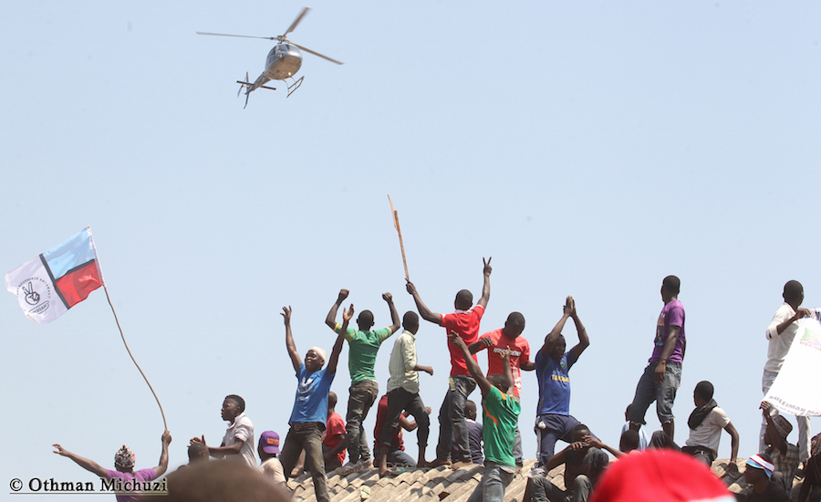 Vinaja wa Jimbo la Mtama Mkoani Lindi wakiishangilia Chopa anayoitumia Mgombea Urais wa Tanzania wa UKAWA kupitia Chama cha Demokrasia na Maendeleo (CHADEMA), Edward Lowassa, kawati ikiwasili kwenye eneo la Mkutano uliofanyika kwenye Uwanja wa Soko la Majengo, Septemba 23, 2015.