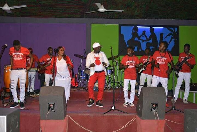 wanamziki wa bendi ya mjengoni wakiwa wanafanya mambo ndani ya jukwaa la kiwanja cha nyumbani mjengoni Klabu.