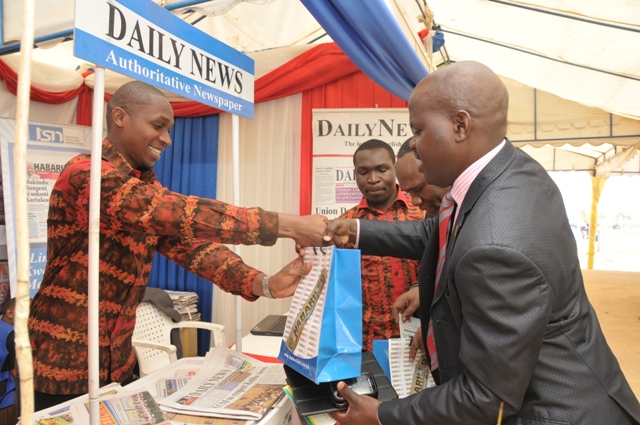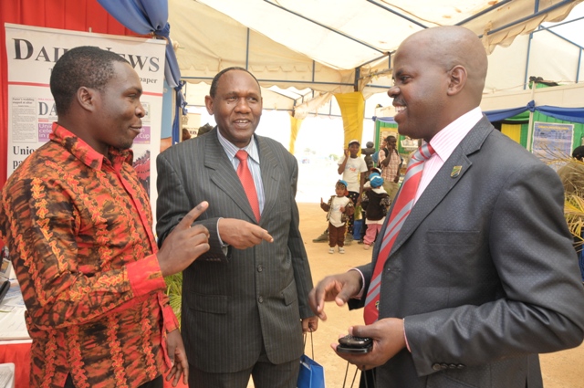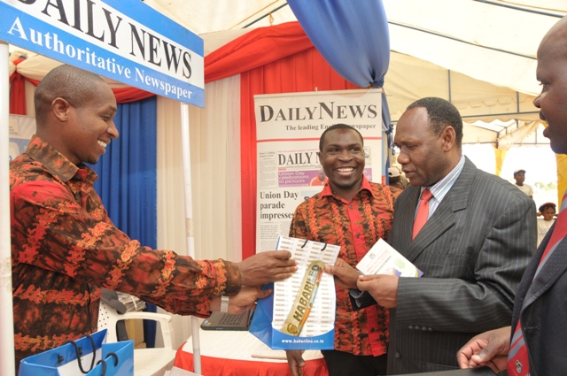 Mkurugenzi wa Idara ya Habari MAELEZO, Assah Mwambene (kulia) akizungumza jambo wakati yeye na Mkurugenzi wa Idara ya Utamaduni kutoka wizara ya Habari, Vijana, Utamaduni na Michezo Prof. Herman Mwasoko walipotembelea banda la Magazeti ya Serikali Tanzania Standard Newspapers (TSN) Wachapishaji wa magazeti ya Daily News, HABARILEO, Sunday News, HABARILEO Jumapili na Spotileo, Nzuguni Dodoma. Kushoto ni Afisa Masoko na Mauzo wa TSN, Chikira Mgheni na Afisa Masoko, Francis Kihinga.