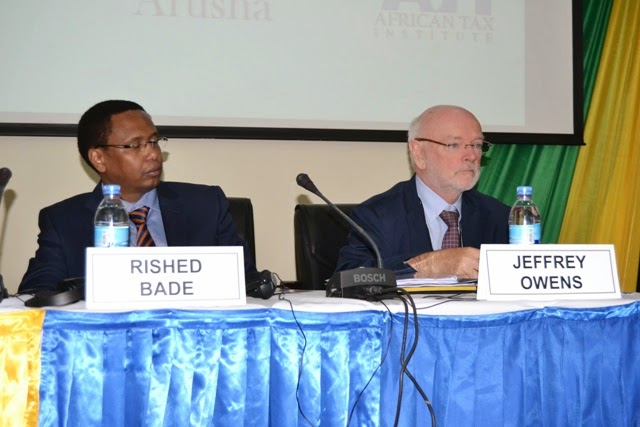 waziri wa fedha Saada Mkuya katikati akiwa na Mkurugenzi Mkuu wa TRA kulia, Rished Bade na kushoto Dk. Jeffrey Owens mtaalam msahuri wa kodi na mhadhiri chuo kikuu cha uchumi na biashara Viena mara baada ya waziri kufungua mkutano wa majadiliano ya masuala ya kodi unaofanyika jijini Arusha.