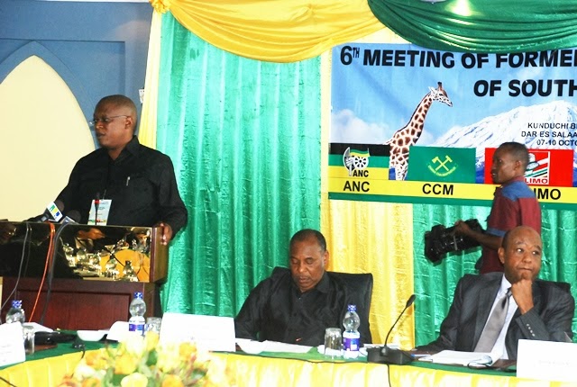 Katibu Mkuu wa CCM, Abdulrahman Kinana akifungua mkutano wa sita wa Makatibu wakuu wa vyama vilivyokuwa vya ukombozi kusini mwa Afrika, leo kwenye hoteli ya Kunduchi Beach, Dar es Salaam. Kushoto ni Katibu wa NEC, Siasa na Uhusiano wa Kimataifa CCM, Dk. Asha-Rose Migiro na Naibu Katibu Mkuu wa CCM, Zanzibar, Vuai Ali Vuai.