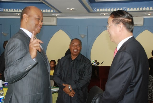 Katibu Mkuu wa CCM, Abdulrahman Kinana akizungumza na Ai Ping wa chama cha CPC cha china wakati wa mkutano huo. Katikati ni Naibu Katibu Mkuu wa CCM (zanzibar), Vuai Ali Vuai.