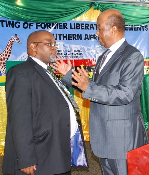 Katibu Mkuu wa Chama Cha ZANU-PF, Didy Mutasa akionyesha alama ya hamasa ya chama chake, alipozungumza na waandishi wa habari, wakati wa mkutano wa makatibu wakuu wa vyama vilivyokuwa vya ukombozi mwa kusini mwa Afrika, kwenye hoteli ya Kunduchi Beach, Dar es Salaam. Kushoto ni Katibu Mkuu wa CCM, Andulrahman Kinana na Wanne kushoto ni Katibu wa NEC, Itikadi na Uenezi, Nape Nnauye.
