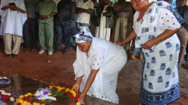 | Jaji wa Mahakama Kuu kanda ya Moshi, Mkoani Kilimanjaro, Aisha Nyerere, akiweka Ua katika Kaburi la aliyekuwa Mkuu wa kitengo cha Usalama Barabarani, Kamishna Msaidizi wa Polisi, James Kombe, aliyezikwa Jana Nyumbani kwake, kijiji cha Msae, Kata ya Mwika, wilaya ya Moshi Vijijini, mkoani Kilimanjaro. |
