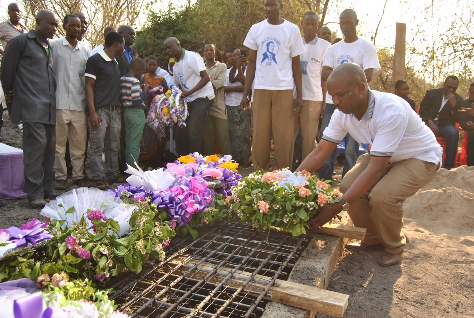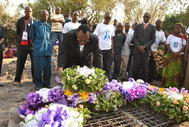 Mke wa marehemu Winfrida Senga akiweka shada la maua katika kaburi la mumewe, marehemu Joseph Senga.