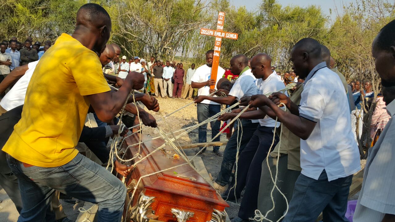 Mwili wa aliyekuwa Mpigapicha Mkuu wa Gazeti la Tanzania Daima, Marehemu Joseph Senga ukiwekwa kaburini wakati wa maziko yake yaliyofanyika katika Kijiji cha Shushi Wilaya ya Kwimba, Mwanza.