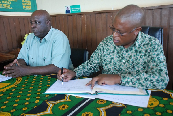 1. Nape akitia saini kwenye kitabu cha wageni, katika Ofisi ya CCM mkoa wa Kilimanjaro mjini Moshi jioni hii. Kushoto ni Mwenyekiti wa CCM mkoa wa Kilimanjaro Iddi Mohammed. (Picha zote na Bashir Nkoromo wa NKOROMO BLOG