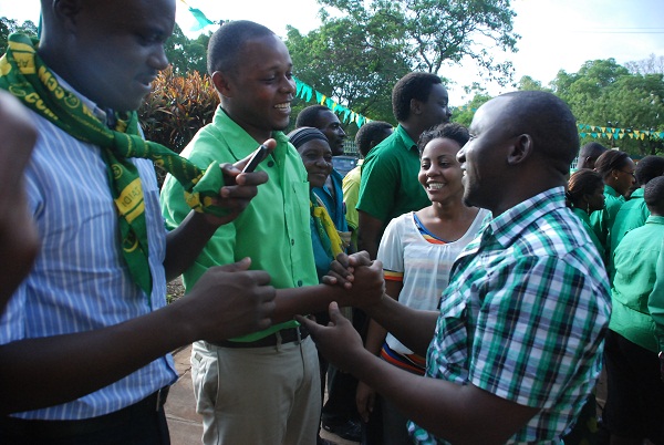 Katika ziara hiyo Nape ameambatana na Vijana waliojiengua hivi karibu kutoka Chadema, Mtela Mwampanga na aliyekuwa Naibu Mwenyekiti wa Baraza la Vijana Chadema, Juliana Shonza. Pichani, Mwampamba na Shonza wakisalimiana na vijana wenzao ambao pia wamehamia CCm hivi karibuni kutoka Chadema mkoani Kilimanjaro, David Waryoba (kushoto) na Yona Makwaya (wapili kushoto)