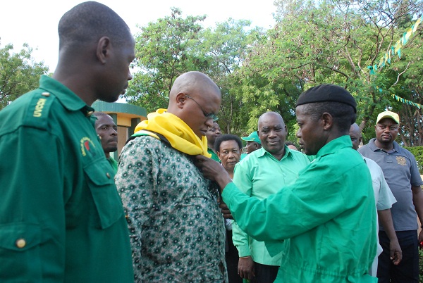 Katibu wa NEC, Itikadi na Uenezi Nape Nnauye akivishwa skafu na Kijana wa CCM baada ya kuwasili Ofisi ya CCM mkoa wa Kilimanajro mjini Moshi jioni hii.