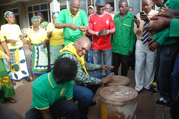 Katibu wa NEC, Itikadi na Uenezi Nape Nnauye akishiriki kucharaza ngoma, iliyokuwa inapigwa na kundi la sanaa la CCM, baada ya kuwasili kwenye Ofisi ya CCM mkoa wa Kilimanjaro jini Moshi jioni hii.