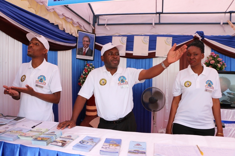 Ofisa Mawasiliano wa NHIF, Luhende Singu (katikati), akiwakaribisha wananchi waliotembelea banda la NHIF.