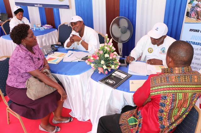 Ofisa wa NHIF (kushoto), akitoa maelekezo kwa wananchi waliofika kwenye banda la NHIF.