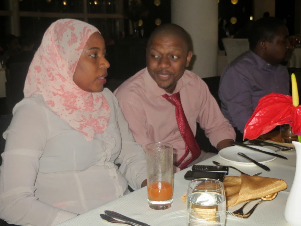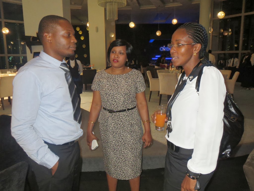 Ofisa Mahusiano wa PSPF, Fatma Elhagy akifafanua jambo kwa mdau wa mfuko huo wakati wa halfa ya chakula cha jioni iliyofanyika jijini Dar es Salaam.