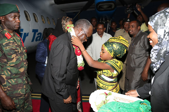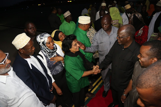 Rais wa Jamhuri ya Muungano wa Tanzania Dkt John Pombe Magufuli akilakiwa  katika Uwanja wa Ndege wa kimataifa wa Abeid Amani Karume mjini Zanzibar leo jioni akitokea kisiwani Pemba