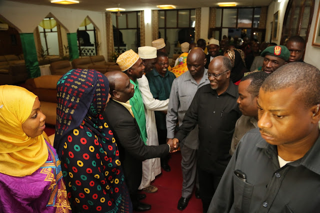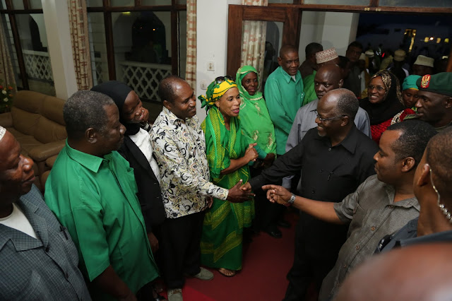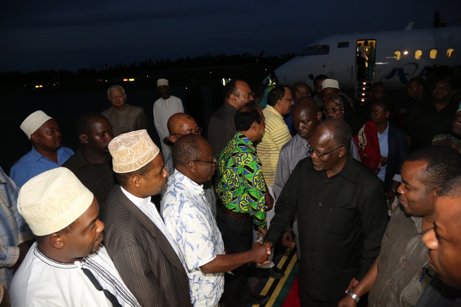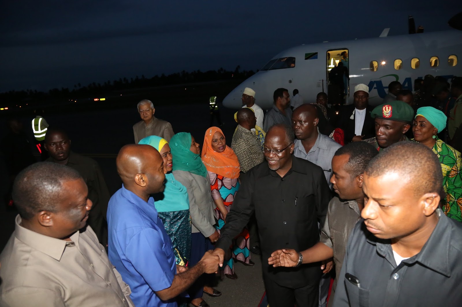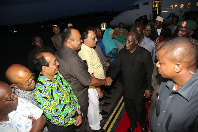Rais wa Jamhuri ya Muungano wa Tanzania Dkt John Pombe Magufuli akilakiwa na viongozi mbalimbali  katika Uwanja wa Ndege wa kimataifa wa Abeid Amani Karume mjini Zanzibar leo jioni akitokea kisiwani Pemba