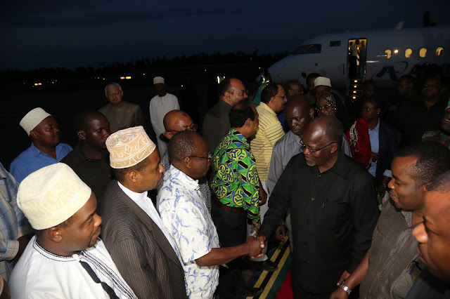 Rais wa Jamhuri ya Muungano wa Tanzania Dkt John Pombe Magufuli akilakiwa na Mjumbe wa Kamati Kuu ya CCM, Mohamed Seif Khatib katika Uwanja wa Ndege wa kimataifa wa Abeid Amani Karume mjini Zanzibar leo jioni akitokea kisiwani Pemba
