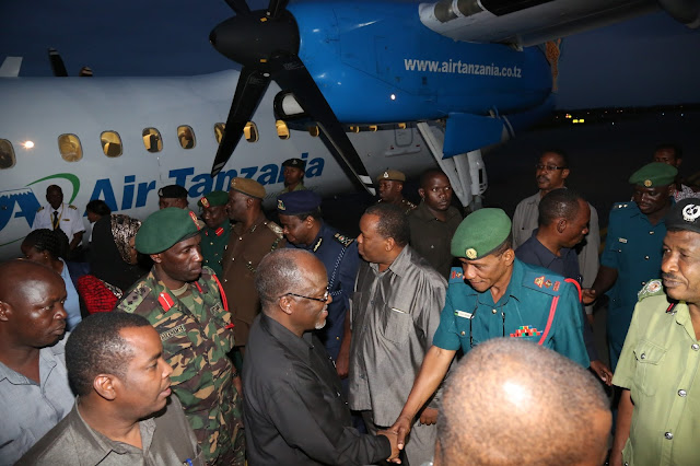Rais wa Jamhuri ya Muungano wa Tanzania Dkt John Pombe Magufuli akilakiwa na makamanda wa vikosi vya ulinzi na usalama  katika Uwanja wa Ndege wa kimataifa wa Abeid Amani Karume mjini Zanzibar leo jioni akitokea kisiwani Pemba