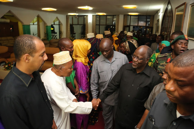 Rais wa Jamhuri ya Muungano wa Tanzania Dkt John Pombe Magufuli akilakiwa na mmoja wa wazee mashiuhuri katika Uwanja wa Ndege wa kimataifa wa Abeid Amani Karume mjini Zanzibar leo jioni akitokea kisiwani Pemba