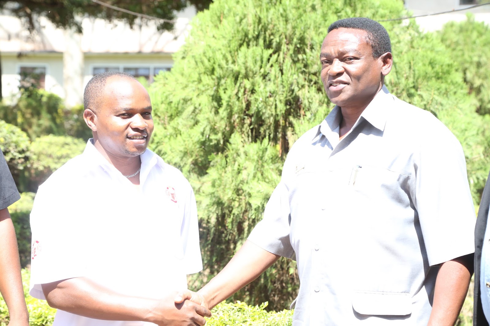 Mkuu wa Mkoa wa Kagera, Meja Jenerali Mstaafu Salum Kijuu akifurahi jambo na  Meneja Usalama wa SBL, Sebastian Kalugul    mara baada ya makabidhiano ya mifuko ya saruji 500 yenye thamani ya shilingi milioni 10 kwa wahanga wa janga la tetemeko la ardhi lililotoa mkoani Kagera.Makabidhiano hayo yalifanyika  Ofisi ya Mkuu wa Mkoa wa Kagera mjini Bukoba mapema leo.