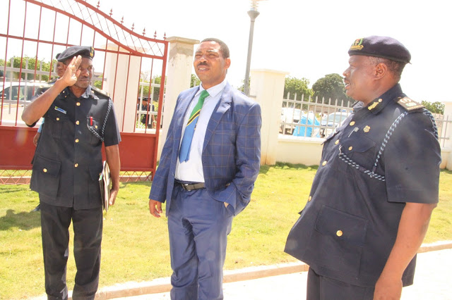Mrakibu Mwandamizi wa Uhamiaji, Abbas Rovya (kushoto), akimpigia saluti Waziri wa Mambo ya Ndani ya Nchi, Mwigulu Nchemba (katikati) kabla ya kukagua nyumba hizo za kisasa. Kulia ni Naibu Kamishna wa Uhamiaji (DCI), Shaban Hamza.