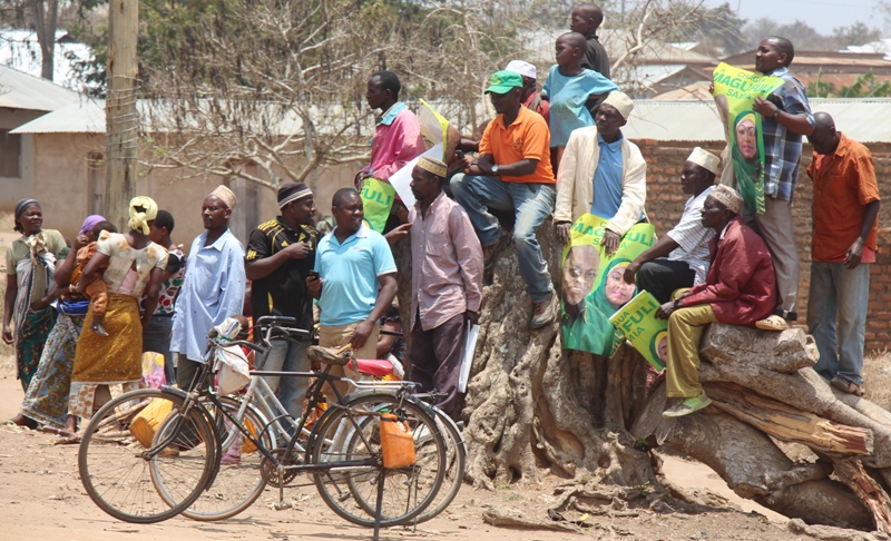 | Baadhi ya wananchi wakiwa wamesimama juu ya kisiki kuweza kumshuhudia mgombea mwenza wa Chama Cha Mapinduzi (CCM) nafasi ya urais, Bi. Samia Suluhu Hassan alipokuwa akiwasili Jimbo la Kilindi. |