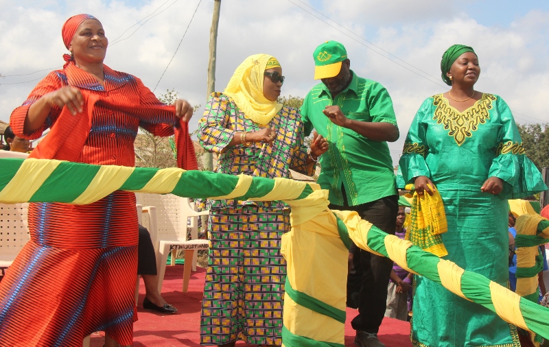 | Kutoka kulia ni mgombea ubunge wa Jimbo la Kilindi, Mboni Muhita akiserebuka na baadhi ya viongozi na makada wa CCM walioongozana kwenye kampeni za mgombea mwenza Wilaya ya Kilindi. |