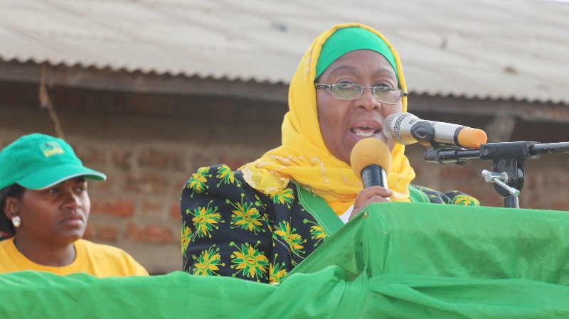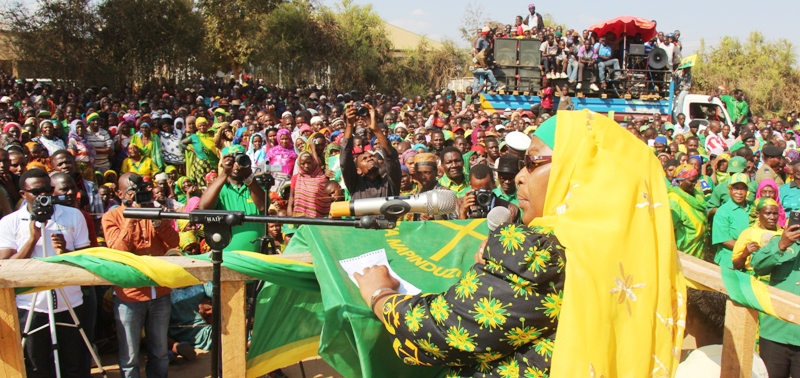 - Mgombea mwenza wa Chama Cha Mapinduzi (CCM) nafasi ya urais, Bi. Samia Suluhu Hassan akizungumza na wanachama wa CCM pamoja na wananchi wa Jimbo la Kilindi kwenye mkutano wa hadhara wa kampeni Mkoa wa Tanga. Miongoni mwa ahadi aliyoitoa kwa wanaKilindi ni kulishughulikia suala la upatikanaji wa huduma za maji safi na salama pamoja na ujenzi wa barabara ya kuingia na kutoka katika Wilaya hiyo.
