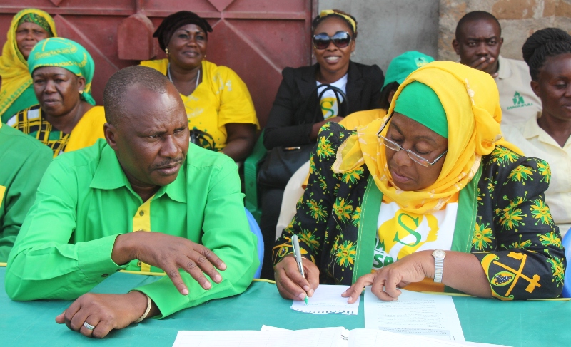 | Mgombea mwenza wa Chama Cha Mapinduzi (CCM) nafasi ya urais, Bi. Samia Suluhu Hassan (kulia) akionesha nakala ya ilani ya chama hicho kwa wananchi kabla ya kumkabidhi, mgombea ubunge wa Jimbo la Kilindi, Mboni Muhita kwenye mkutano wa hadhara wa kampeni Mkoa wa Tanga. |