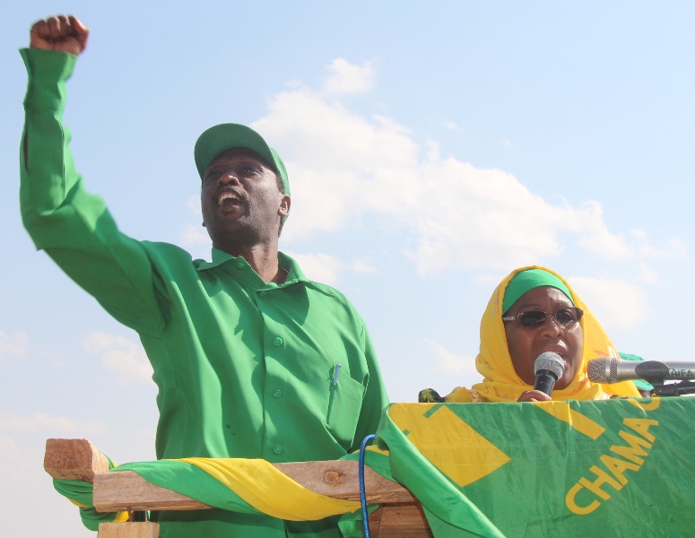 | Mgombea mwenza wa Chama Cha Mapinduzi (CCM) nafasi ya urais, Bi. Samia Suluhu Hassan (kulia) akimtambulisha mgombea ubunge wa Jimbo la Kilindi, Mboni Muhita kwa wanachama wa CCM pamoja na wananchi wa Jimbo la Kilindi kwenye mkutano wa hadhara wa kampeni Mkoa wa Tanga. |