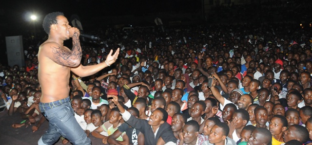 Msanii Ommy Dimpozi, akicheza na shabiki wake.
