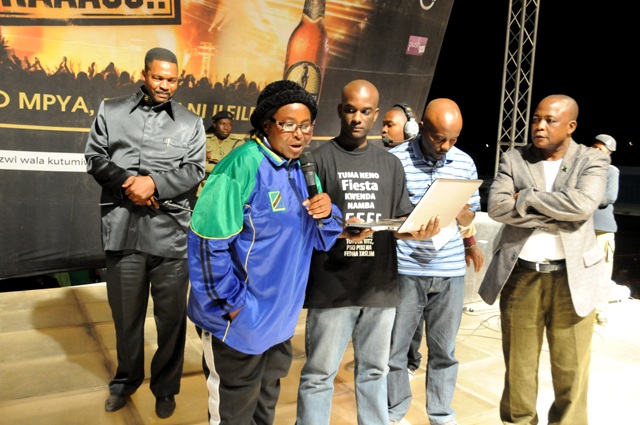 Mkuu wa Mkoa wa Dodoma, Dk. Rehema Nchimbi akisoma jina la mshindi wa gari aina ya Vitz inayotolewa na kampuni ya Push Mobile, ikiwa ni sehemu ya mchakato wa tamasha la Serengeti Fiesta 2012, pichani kati ni Meneja masoko wa kampuni ya Push Mobile, Rodney Lugambo, mwakilishi wa Michezo ya Bahati Nasibu ya Taifa, Humudi pamoja na Mkuu wa Wilaya ya Dodoma Mjini, Lephy Gembe.