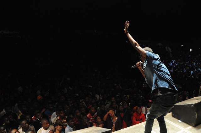 Rich Mavoco akiwaimbisha washabiki wake kibao waliojitokeza kwa wingi kwenye tamasha la Serengeti Fiesta 2012 linalofanyika usiku huu ndani ya uwanja wa Jamhuri.