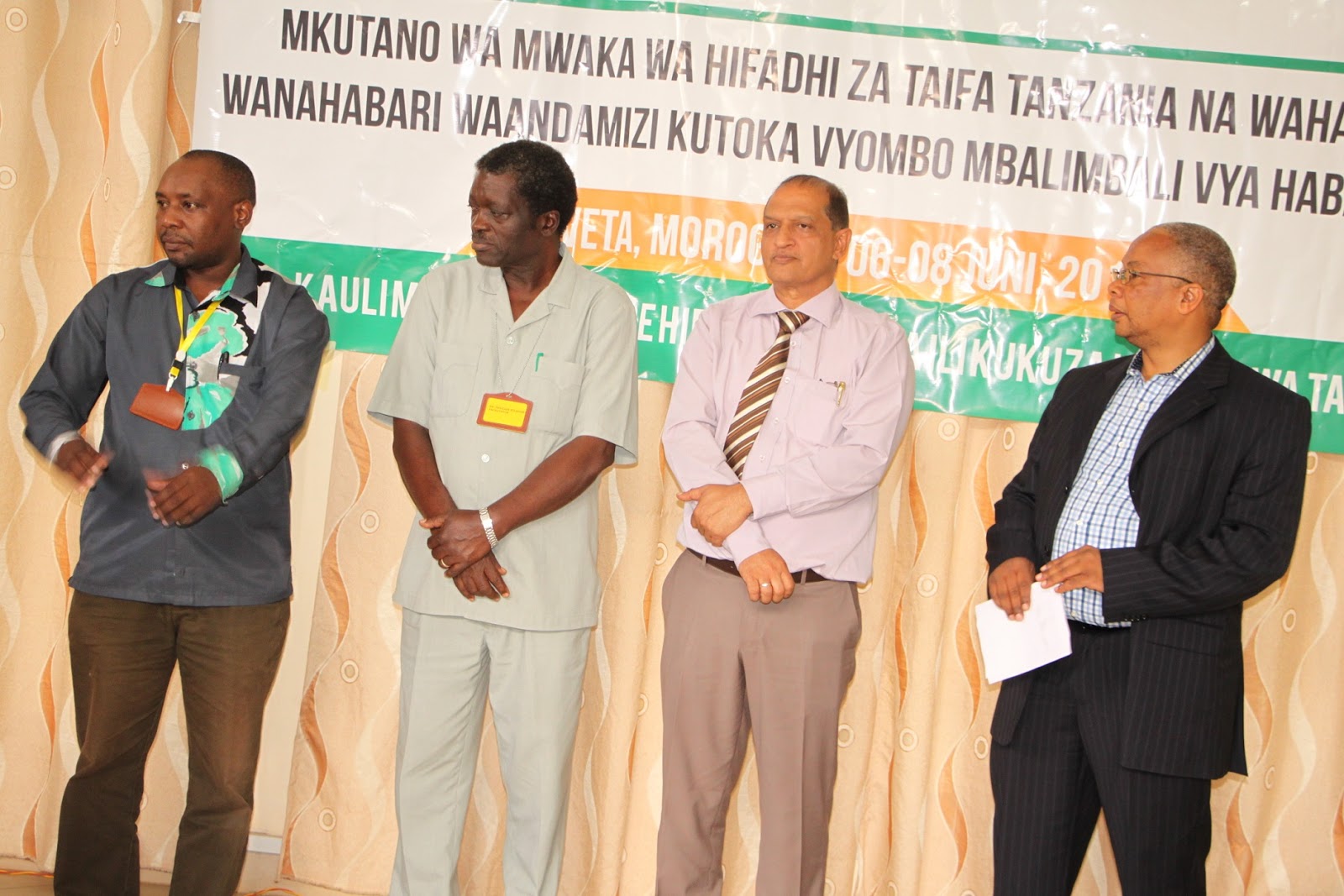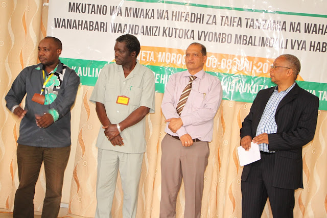 Mkurugenzi Mkuu  Hifadhi ya Taifa Tanzania (TANAPA), Allan Kijazi (kulia), akiwa na viongozi wengine kabla ya kuanza zoezi la kutoa vyeti kwa wanahabari washiriki wa mkutano huo. Kutoka kushoto ni Jaji Tuzo za Habari za Tanapa, Jack Muna, Mwenyekiti wa Taasisi ya Utafiti wa Misitu Tanzania (Tafori), Dk.Felician Kalahama na Mkurugenzi wa Utalii na Masoko, Ibrahim Mussa.