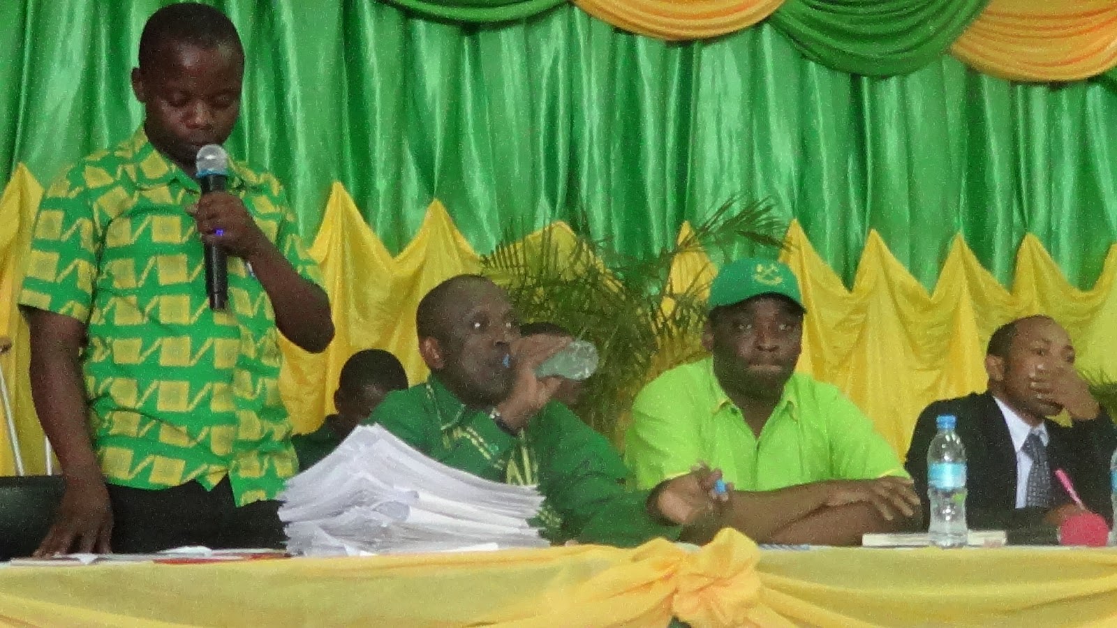 | Sadifa (aliyevaa suti) akiongoza vijana kucheza kwaito katika ukumbi wa CCM mkoa wa