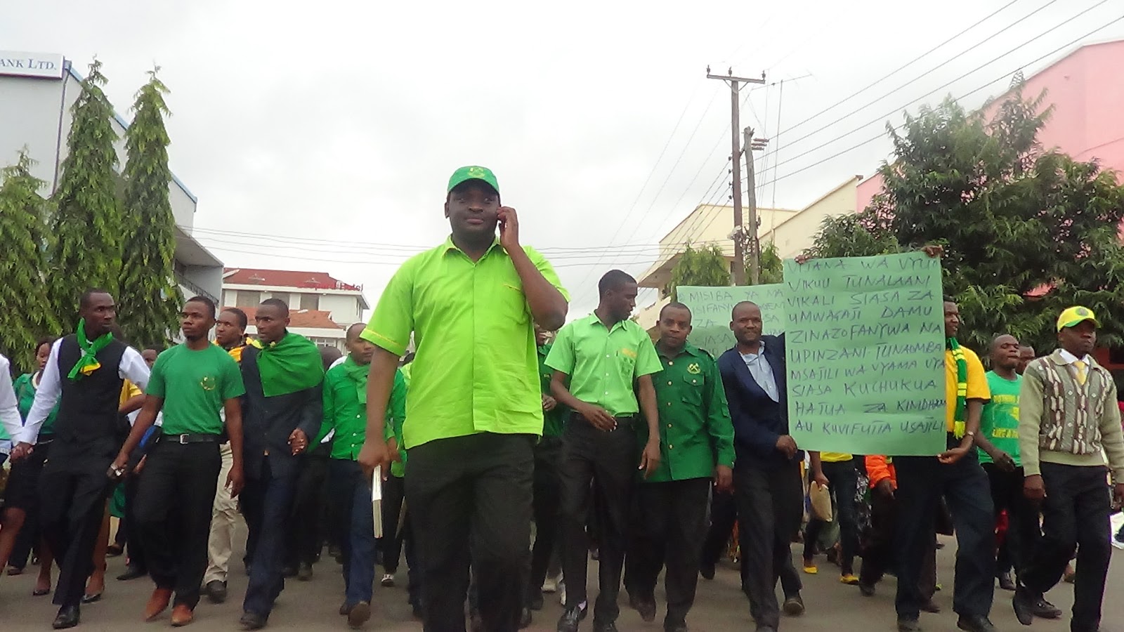 | Mwenyekiti wa UVCCM Kilimanjaro akiongoza maandamano kuelekea katika ukumbi wa CCM mkoa ambapo ndipo ilikofanyikia mkutano mkubwa wa UVCCM jana |