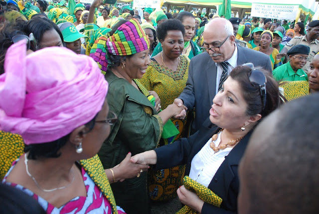 UNAONA WANAVYOWASHANGILIA! Katibu wa NEC ya CCM, Siasa na Uhusiano wa Kimataifa, Dk. Asha-Rose Migiro akimwambia Mjumbe wa Kamati Tendaji ya Chama Cha Ukombozi cha Palestina (PLO), Jehad Abu Zead, wakati ujumbe wa chama hicho ulipowasili kwenye viwanja vya Mnazi Mmoja jijini Dar es Salaam, kwa ajili ya sherehe maalum, iliyoandaliwa na UWT kwenye viwanja hivyo jijini Dar es Salaam. Watatu kushoto ni, Makamu Mwenyekiti wa PLO, Tayseer Khalid na Mwenyekiti wa UWT, Sophia Simba.