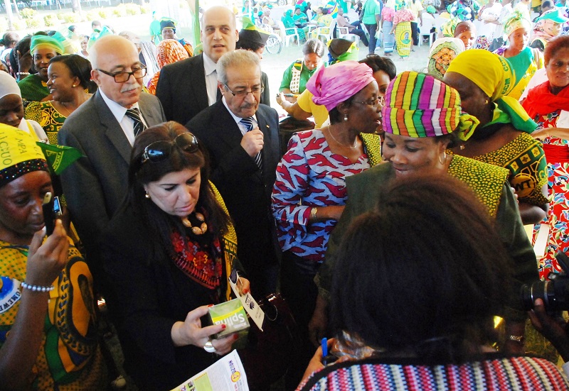Mjumbe wa Kamati Tendaji ya Chama Cha Ukombozi wa Palestina (PLO) Jihad Abu Zead akitazama bidhaa za kina mama wa UWT, ujumabe wa Makamu Mwenyekiti wa PLO, Tayseer Khali (kulia kwa Jihad), ulipowalisi. Wengine ni Mwenyeji wao, Katibu wa NEC ya CCM, Siasa na Uhusiano wa Kimataifa, Dk. Asha-Rose Migoro na Mwenyekiti wa UWT, Sophia Simba.