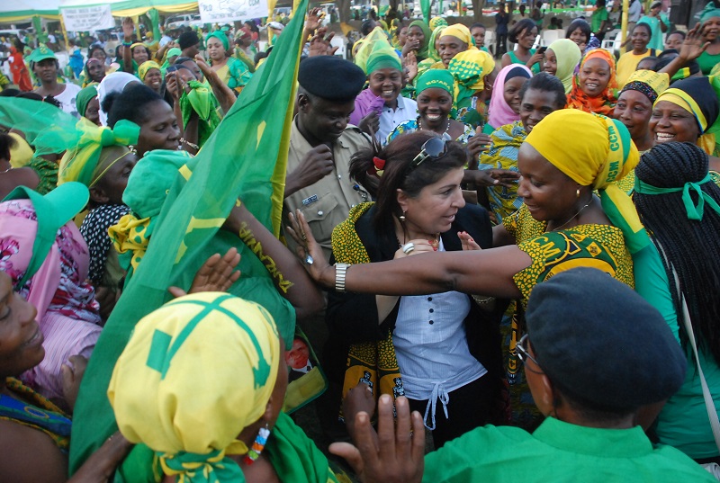 Wana-UWT wakiwa wamemzonga Jihad na hivyo Katibu Mkuu wa UWT Amina Makilagi kulazimika kutumia msuli kuwazuia, walipokuwa wakimshangilia kiongozi wakati akiondoka Uwanjani