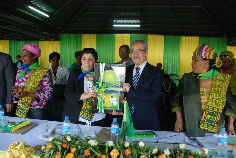 Mjumbe wa Kamati Tandaji wa PLO, Jihad akionyesha zawadi aliyopewa na wanachama wa UWT katika sherehe hiyo. Kushoto ni Katibu wa NEC ya CCM, Siasa na Uhusiano wa Kimataifa, Dk. Asha-Rose Migiro na Kulia ni Mwenyekiti wa UWT Sophia Simba na Makamu Mwenyekiti wa PLO Tayseer Khalid