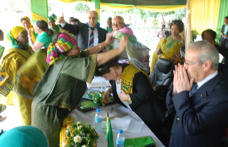 Mwenyekiti wa Ujoma wa Wanawake Tanzaia (UWT) Sophia Simba akimzadia nguo, Mjumbe wa Kamati Tendaji wa Chama Cha Ukombozi wa Palestina (PLO), Jehad Abu Zead, wakati  cha Palestina (PLO) Jehad Abu Zead, akimpa kadi mwanachama mpya wa CCM, Mohamed Ali, katika sherehe maalum iliyoandaliwa na UWT leo kumkaribisha Makamu Mwenyekiti wa PLO, Tayseer Khalid (kulia) na ujumabe wake, kwenye Viwanja vya Mnazi Mmoja, Dar es Salaam.