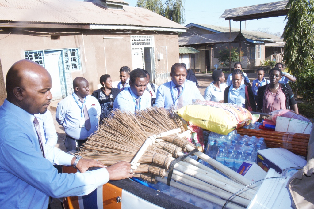 Wafanyakazi wa Benki ya NMB,tawi la Nelson Mandela mjini Moshi wakiwa wamebeba vifaa mbalimbali kwa ajili ya kufanyia usafi katika hospitali ya rufaa ya Mawenzi.