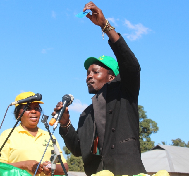Bi. Mwanahawa Said (kushoto) akikabidhi kadi yake ya CUF pamoja na za wenzake jumla 52 katika mkutano wa kampeni. |