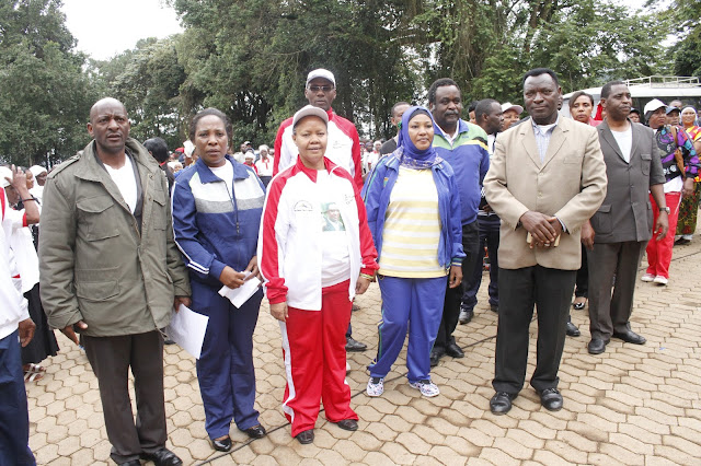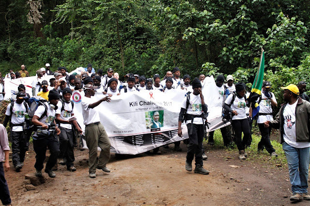 Timu ya Wanaharakati 86 kutoka taasisi na kampuni mbalimbali walioshiriki changamoto ya kupanda Mlima Kilimanjaro kwa ajili ya kuchangisha fedha za kusaidia mapambano dhidi ya Ukimwi wakishuka kutoka katika kilele cha Uhuru.
