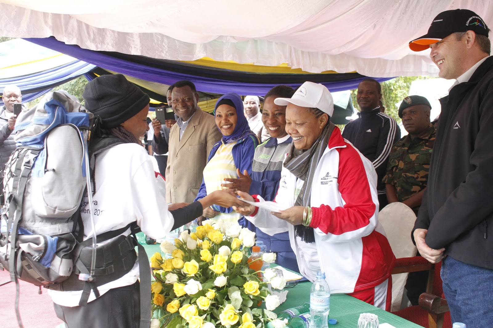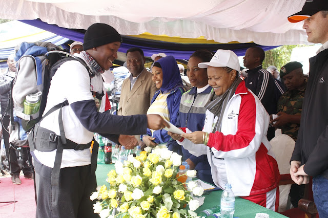 Mkuu wa Mkoa wa Kilimanjaro,Anna Mngwira akijiandaa Timu ya Wanaharakati wakati wakishuka kutoka kilele cha Uhuru, Mlima Kilimanjaro.