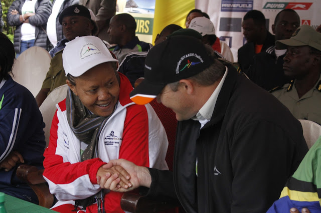 Mkuu wa Mkoa wa Kilimanjaro, Anna Mngwira akisalimiana na Mkuu wa Wilaya ya Geita, Herman Kapufi aliyeshiriki Changamoto ya kupanda Mlima Kilimanjaro kwa ajili ya kuchangisha fedha za mapambano ya Ukimwi.