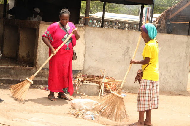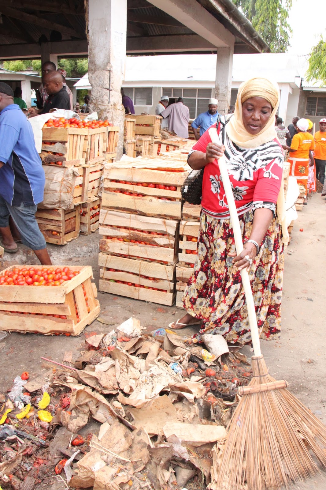 Makamu Mwenyekiti wa Soko hilo, Issa Ndilima (kulia), akishiriki kufanya usafi. Kushoto ni Kashinde Kapambale na Aisha Juma kutoka soko la Muslim