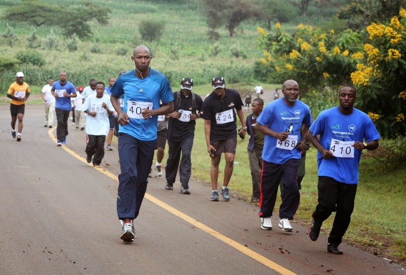 Washiriki wa Mbio za Tigo Ngorongoro Kilometa 5 za Makapuni wakimenyana vikali.