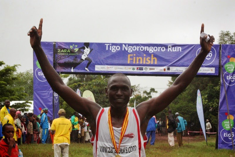 Mshindi wa kwanza wa Mbio za Tigo Ngorongoro kwa kilomita 21 (Half Marathon) kwa upande wa wanaume, Alphonce Felix akimaliza kwa furaha.